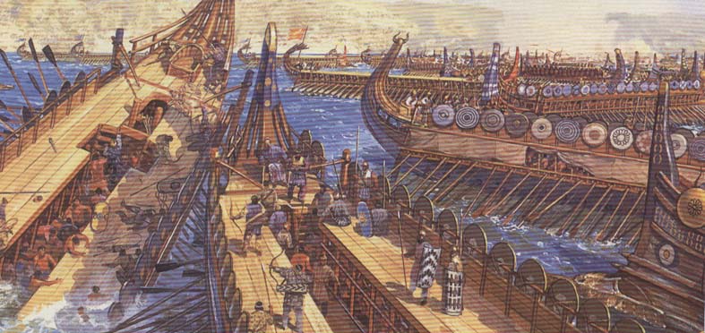 당대의 해전은 주로 뱃머리에 달린 청동 충각으로 적의 배를 침몰, 파손시키는 것이다. 물론 로마는 보딩 즉 배를 접근시켜 월선한 후 백병전으로 적군을 제압했는데 이는 로마의 해전 전투가 충각전투에서 변경되었기 때문이다. 임진왜란 때 조선은 판옥선으로 일본과 맞섰는데 이때 일본은 보딩 전법으로 백병전을 기본으로 했다. 그러나 조선은 백병전을 피하여 일본군이 배에 오르지 못하게 했다. 이유는 조선의 판옥선이 일본 배보다 거대하고 튼튼한데다 일본의 접근전을 원천으로 봉쇄했다. 거북선 지붕에 철심을 꼽았다는 것도 이런 연유다.